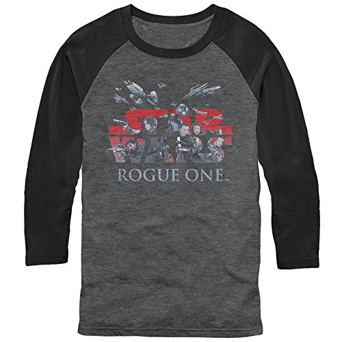 Studio : Fifth Sun Publisher : Fifth Sun Binding : Apparel Product Description Play your part in the Galactic Civil War in style with the Star Wars Rogue One Rebellion Logo Black and Gray Baseball Tee! The rebel heroes Jyn, Chirrut, Cassian, Bodhi, K-2SO, and Baze shape the "Star Wars Rogue One" logo across this gray Rogue One tee with 3/4 length black raglan sleeves. Body: 50% Cotton, 50% Polyester. Sleeves: 100% Cotton. 0
