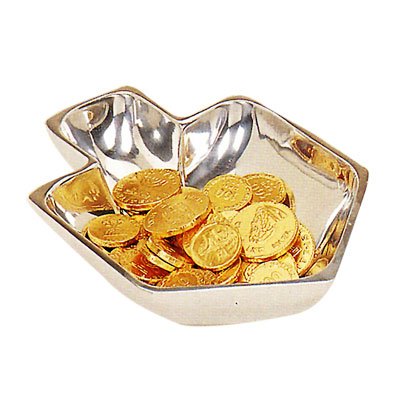 Product Description Aluminum highly polished silver bowl in the shape of a dreidel. Perfect hostess gift and makes a wonderful candy display for your chocolate gelt. Dimensions: Length: 8.75. Height: 1.75 Width:6.5 inches 0