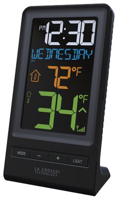 Bright multiple colored digital thermometer and clock keeps you informed with accurate temperature & time. Indoor display receives frequency wirelessly from outdoor temperature sensor. Battery operated or use indoor base with provided AC adapter.