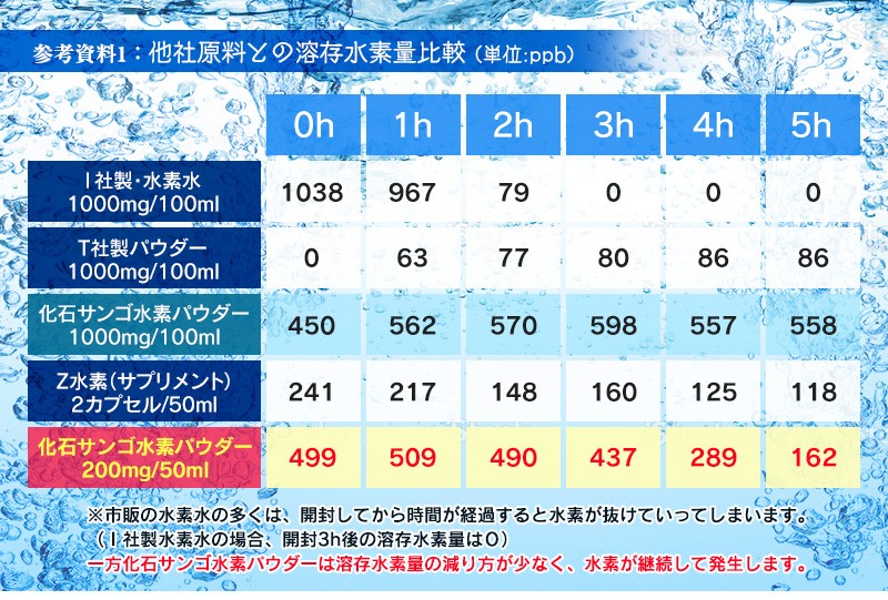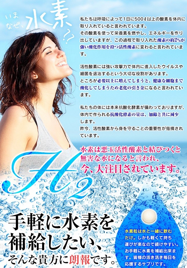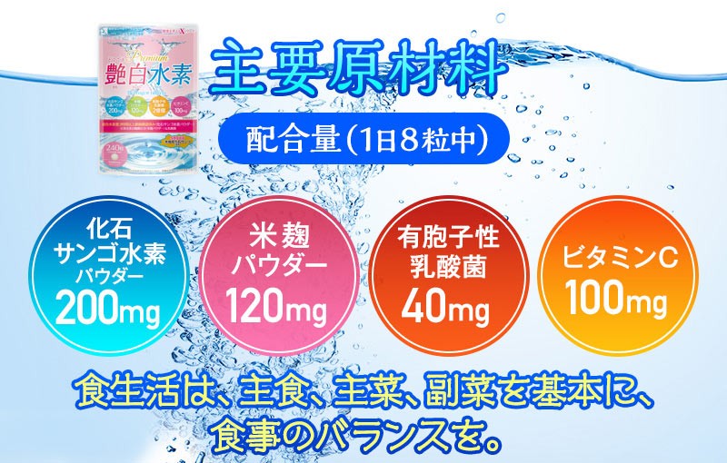 1日8粒(2g)あたり 化石サンゴ水素パウダー 200mg米麹パウダー 120mg有胞子性乳酸菌 2億個ビタミンCは、皮膚や粘膜の健康維持を助けるとともに、抗酸化作用を持つ栄養素です。・本品は、多量摂取により疫病が治癒したり、より健康が増進するものではありません。1日の摂取目安量を守ってください。・本品は、特定保健用食品とは異なり消費者庁長官による個別審査を受けたものではありません。1日あたりの摂取目安量に含まれる当該栄養成分の量が栄養素等表示基準値(18歳以上、基準熱量2,200kcal)に占める割合:ビタミンC 100%食生活は、主食、主菜、副菜を基本に、食事のバランスを。