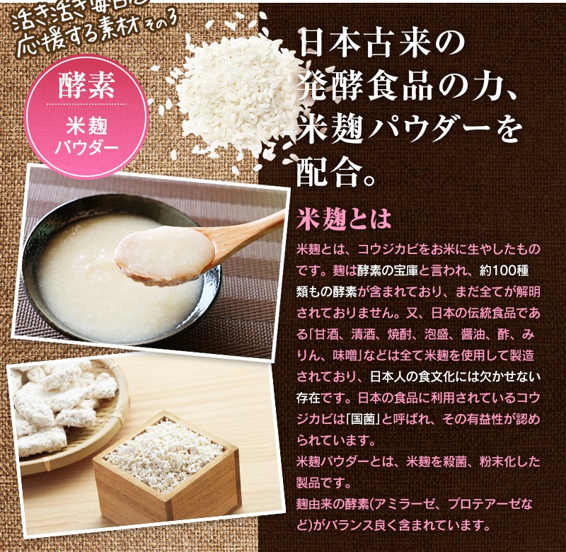 原材料 デキストリン、米麹パウダー、有胞子性乳酸菌/結晶セルロース、サンゴカルシウム、ビタミンC、ステアリン酸Ca