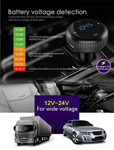 5-in-1 Functionality: DUAL USB CAR CHARGER, BLUETOOTH RECEIVER, FM TRANSMITTER, HANDS-FREE CALLS, CAR BATTERY VOLTAGE MONITOR.