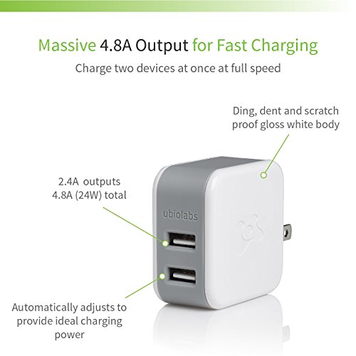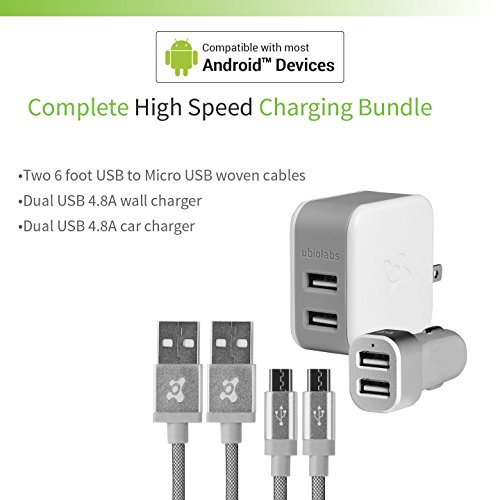 Ubio Labs 6ft tangle free Micro USB cable kit for Android, Samsung, HTC, LG, Motorola. Long woven charge/sync cord with dual USB wall and car charger. 2.4A /4.8A (24W) output for fast charge.