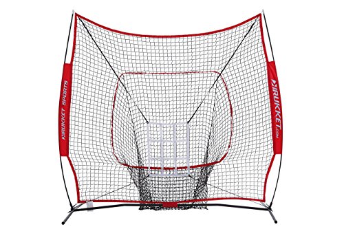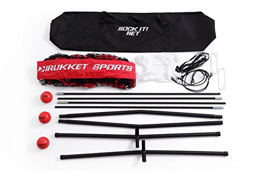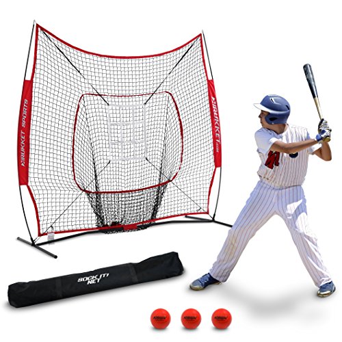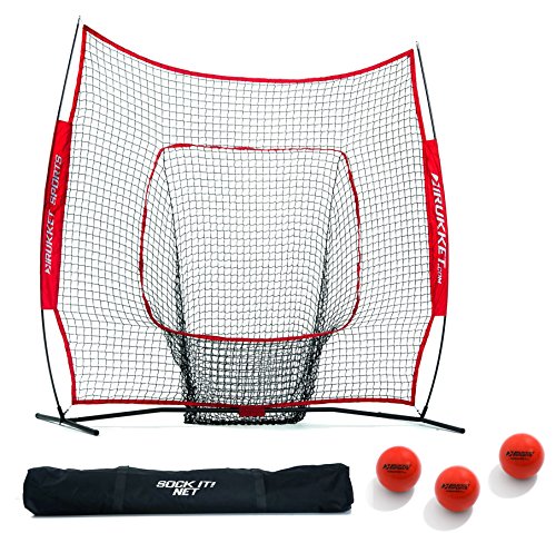 INCLUDES 4 ITEM BUNDLE: Original Rukket Sock It! 7x7 baseball/softball sock-style bow frame net, three PurePower weighted training balls, strike zone target, and carry bag.