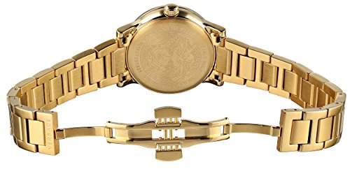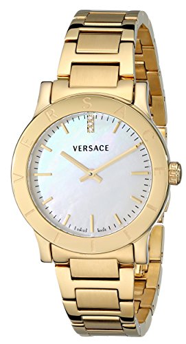 Representing the classic designer style of Versace this women's watch is an example of extreme comfort high quality and chic style combined. Lightweight and sure to impress it is a true example of functional luxury. Its white mother of pearl dial features 3 sparkling diamonds in the 12 position and a minute track and is surrounded by a yellow gold IP stainless steel bezel engraved with the 'Versace' logo. Its beautiful yellow gold IP stainless steel linked bracelet comfortably secures with a fold over clasp for safe all-day wear. Powered by reliable Quartz movement and water resistant to 30 meters it is an accessory sure to bring a smile to your face for many years to come.