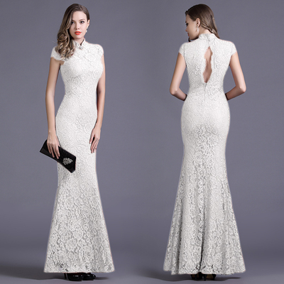 露背立领包肩短袖弹力蕾丝鱼尾修身旗袍敬酒晚礼服长裙