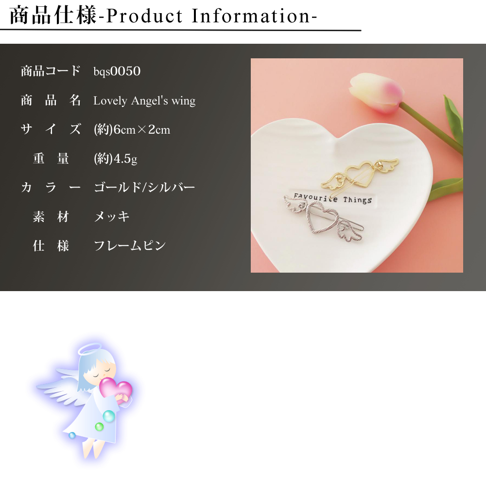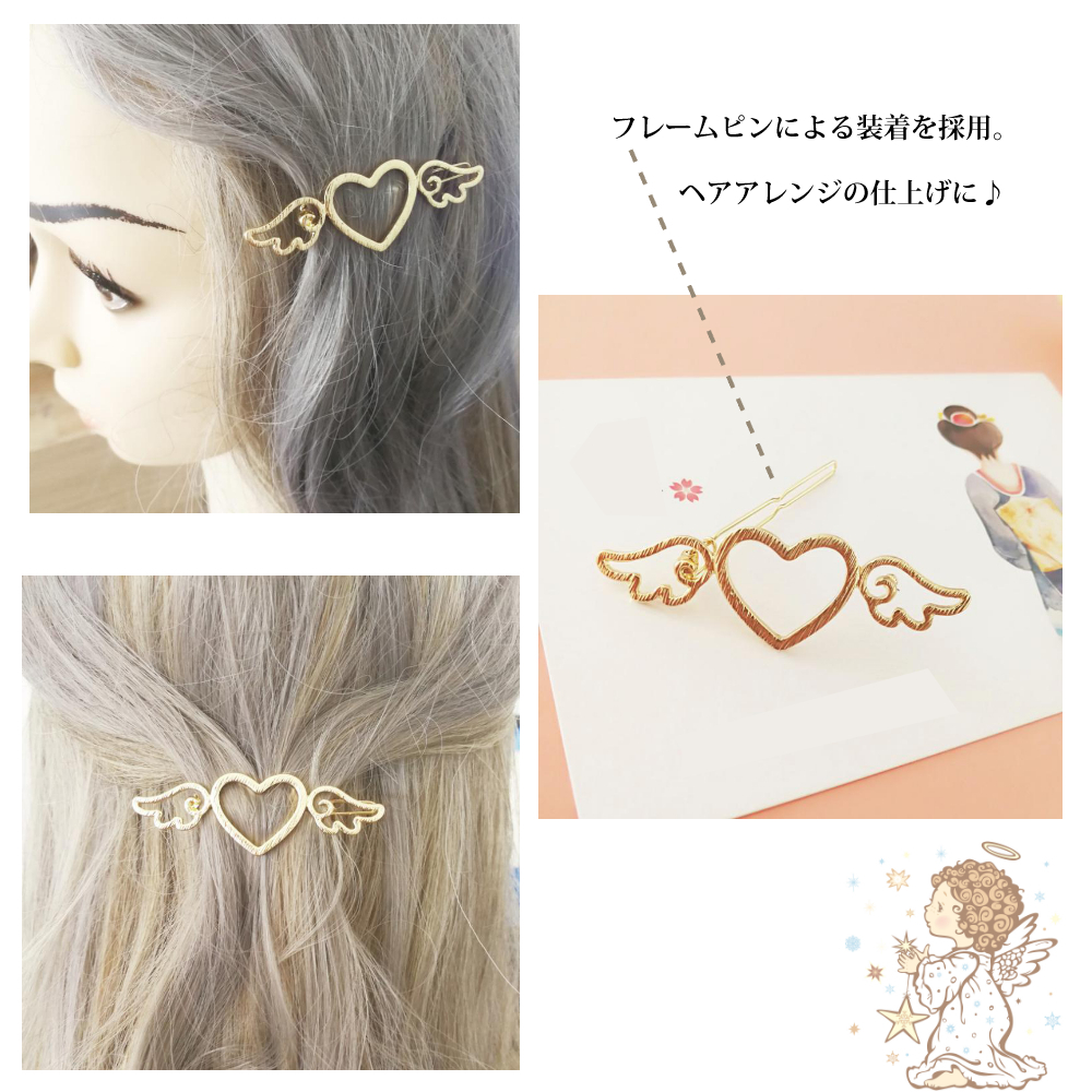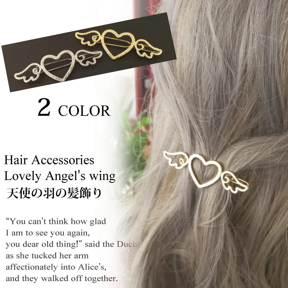 商品コード:bqs0050商品名:Lovely Angel's wingサイズ:(約)6cm×2cm素材:メッキカラー:シルバー/ゴールド仕様:フレームピン◆ハートと羽の可愛いヘアアクセサリ◆派手過ぎず地味過ぎない、素敵な可愛らしさ◆シルバーとゴールドから色をお選び頂けます