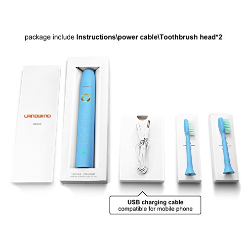 Studio : Landwind Publisher : Landwind Binding : Health and Beauty Product Description 5 working modes: Clean, refresh, white, gum care, sensitive 100 days standby time vibrational frequencies: 31000 times per minute water-proof rate: Ipx7 sound intensity: <42db operating temperature: 0~40 Celsius battery: Lithium battery, 3.7v, 2000mah package size: 8.2 inch x 3.1 inch x2.1 inch working mode: 2 minutes in total, pause per 30s package includes: Sonic toothbrush handles x 1, toothbrush head x 2, user manual x 1, usb charger cable x 1. 0