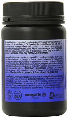 Omega Plus® is a specially formulated blend of certified organic, unrefined flax and borage seed oils that offers an optimal combination of EFAs (essential fatty acids) and GLA's (gamma-linolenic acids), a potent natural derivative of the Omega-6 EFA. The Borage plant has been consumed for generations in Europe, but only recently was its seed identified as a potent natural source of the omega-6 EFA derivative and gamma-linolenic acids (GLA's). Borage Oil has a higher concentration of GLA than black currant or evening primrose oils. It's also more cost-effective as Borage seeds are larger and contain more oil. Borage oil is the preferred source of GLA among many nutritionists and natural health practitioners. Organic flax oil is the richest vegetarian source of omega-3 essential fatty acids (EFA's). Since our bodies cannot produce EFA's, they must be obtained from our diet. Flax seed oil is unique because it contains both omega-3 and omega-6 fatty acids that are necessary for maintaining good health. The best of both! Omegaflo® Flax Seed Oil (500 mg) with 100 mg borage oil for the synergistic benefits of omega-3 EFAs and gamma linolenic acid (GLA). Easy-to-swallow capsule in a light-protected opaque container.Feature