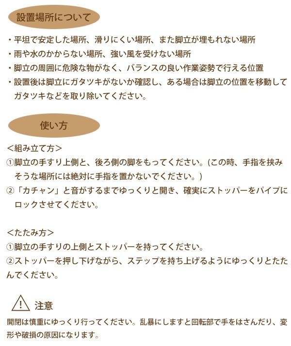 | 素材・材質 | ステップ:スチール(粉体塗装) トレー:ポリプロピレン グリップ:ウレタン 脚キャップ:ポリプロピレン |