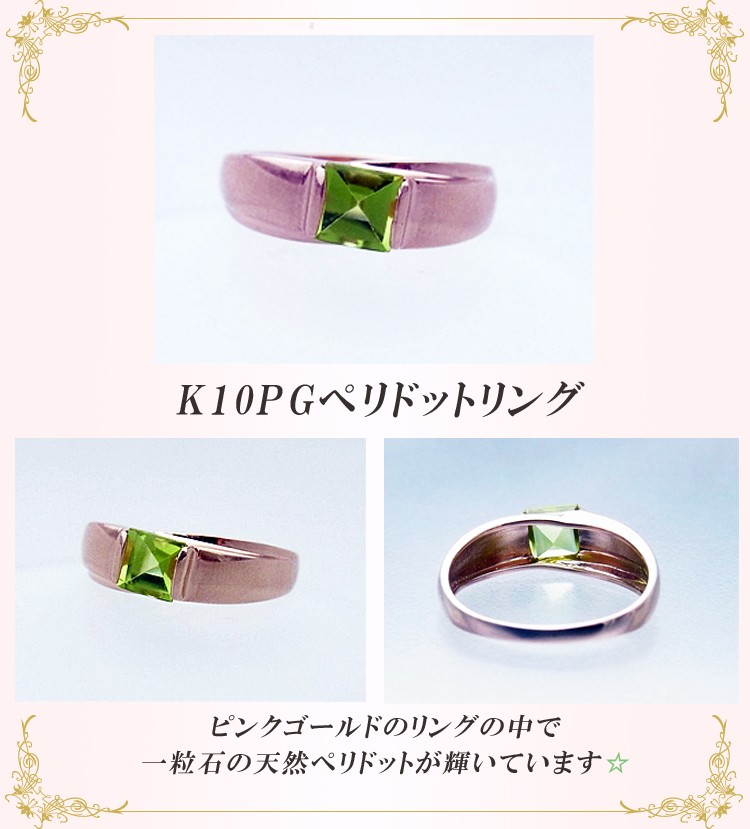 商品説明 1粒石のペリドットが輝いていて綺麗です。素材はピンクゴールドです。