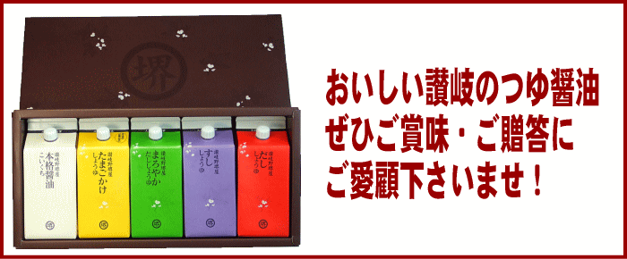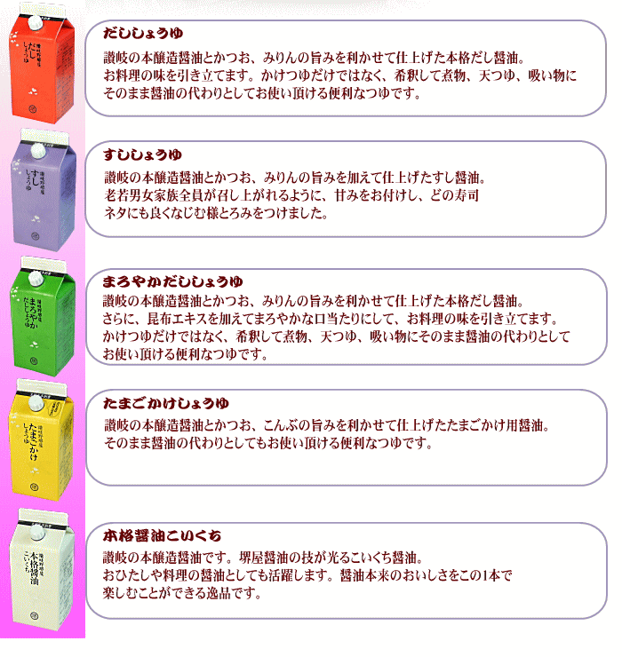 商品内容以下各200ml■こいくちしょうゆ1個■たまごかけしょうゆ1個■まろやかだししょうゆ1個■さしみしょうゆ1個■だししょうゆ1個賞味期間 常温保存約10ヶ月※開栓後要冷蔵配送 常温宅急便送料 国内全国一律525円四国一律315円原材料 ■こいくち醤油脱脂加工大豆(遺伝子組換えでない),小麦,食塩,アミノ酸液,甘味料,調味料(核酸),カラメル色素,保存料(原材料の一部に大豆,小麦を含む)■まろやかだし醤油本譲造醤油,蛋白加水分解物,鰹節,鰹節エキス,昆布エキス,米発酵調味料,砂糖,食塩,甘味料,調味料(アミノ酸等),(原材料の一部に大豆,小麦,豚肉を含む)■たまごかけ醤油本醸造醤油,米発酵調味料,鰹節,鰹節エキス,鰹エキス,砂糖,食塩,蛋白加水分解物,調味料(アミノ酸等),ビタミンB1,乳糖,酵母エキス(原材料の一部に大豆,小麦,豚肉を含む)■すし醤油本醸造醤油,液糖,蛋白加水分解物,鰹節,鰹節エキス,調味料(アミノ酸等),カラメル,増粘材(キサンタンガム)(原材料の一部に大豆,小麦,豚肉を含む)■だし醤油本譲造醤油,蛋白加水分解物,鰹節,鰹節エキス,米発酵調味料,砂糖,食塩,甘味料,調味料(アミノ酸等),(原材料の一部に大豆,小麦,豚肉を含む)