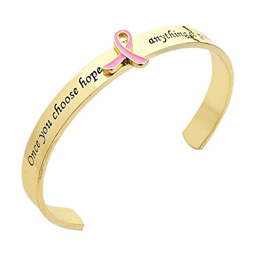 -. Feature : Pink Ribbon breast cancer awareness cuff bracelet / Inscription reads "Once you choose hope anything is possible" / Cuff measures 5/8" in width, with a 1 1/8 inch opening in back / Easy to put on bracelet fits small to medium wrists / Packaged in a lovely gift box