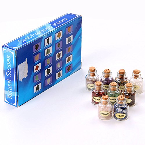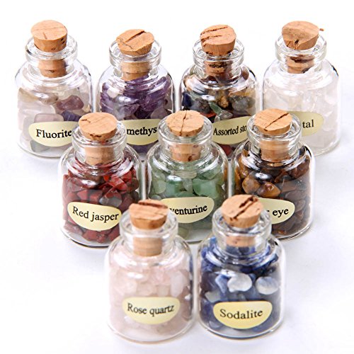 Material: Aventurine,Clear Crystal,Red Jasper,Fluorite,Sodalite,Amethyst,Rose Quartz,Tiger eye,Assorted Stone. Weight: Approx 155g Qty: 9 bottles each box You are looking nine bottles mini stones from front to back. You will get the same show in the picture.