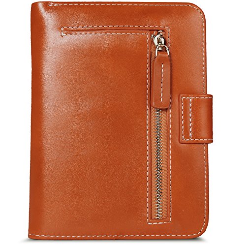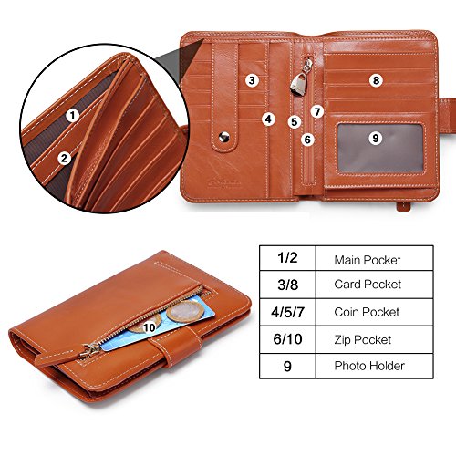 - [HIGH QUALITY MATERIAL] Luxurious oil wax cow leather, durable fabric lining with custom light gold hardware, and heavy-duty zipper, these make the leather wallet more luxury.