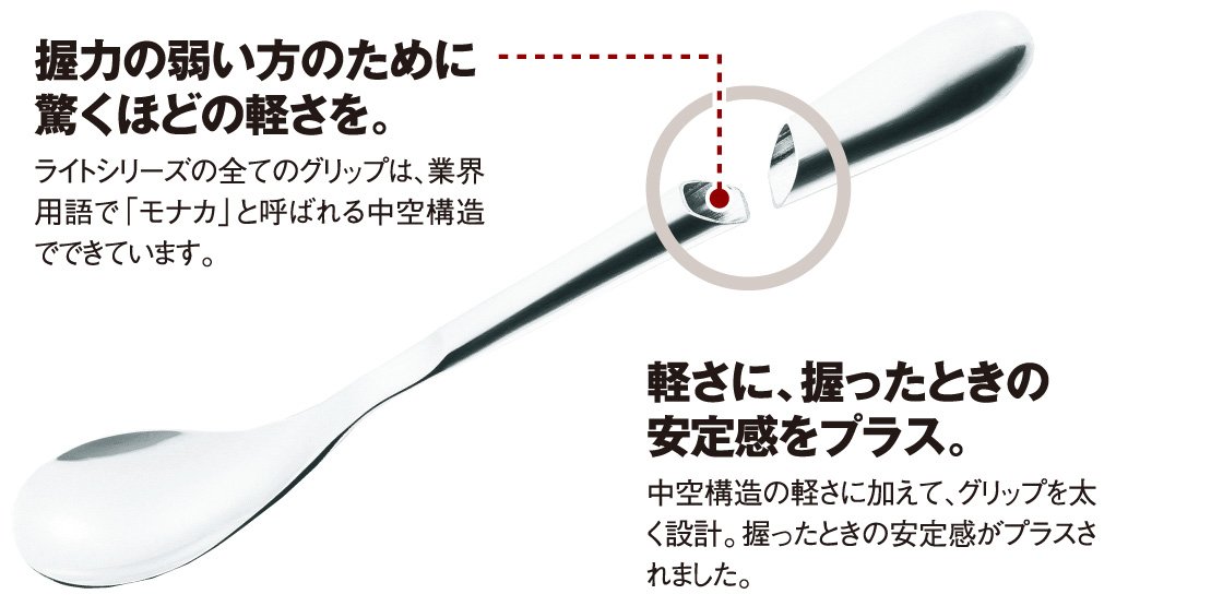 The grip is thick, but it can be lightened by making it a hollow structure, and you can eat with plenty even those with low grip strength.