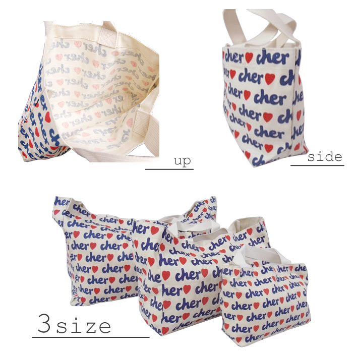 ◇商品説明cherのロゴプリントがとってもキュートなトートバッグ☆お買い物や通勤、通学にも使いやすい大きめサイズのキャンバス地トートです♪モデルでタレントの梨花さんのブログで大人気になったトートバッグです。◇素材◇素材:コットンキャンバス◇サイズ◇横:38cm 高さ:28cm マチ:約15.5cm 持ち手:約36cm ☆PCの環境によっては画面上と実物で多少色具合が異なって見える場合がございます。☆お洗濯表示は必ずお読みくださいませ。☆平置きでの採寸の為、実寸とは多少誤差が生じます。 ご了承くださいませ。☆店舗同時販売のため在庫切れの場合がございます。 ご了承くださいませ。