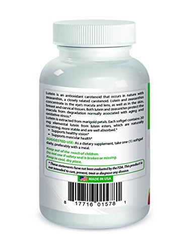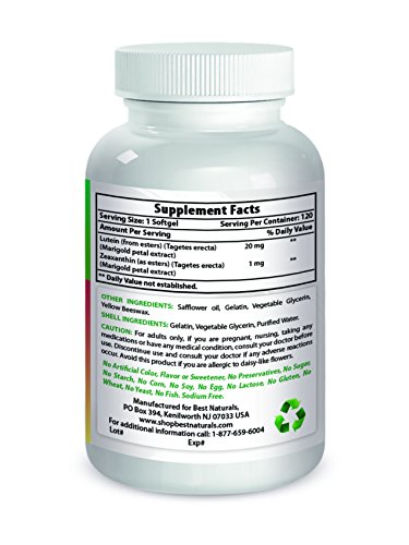 -. Binding : Health and Beauty -. Brand : Best Naturals -. EAN : 0817716015781 -. Feature : Supports Eye Health / Natural Caratenoid / Supports Healthy Vision / Supports Mascular Health / All Best Naturals products are manufactured in accordance with Good Manufacturing Practices (GMP), among the highest standards in the world -- Proudly Made in USA -- Purity & Potency Guaranteed -. IsAdultProduct : 0 -. Label : Best Naturals -. Manufacturer : Best Naturals -. MPN : 817716015781 -. PackageQuantity : 1 -. PartNumber : 817716015781 -. ProductGroup : Health and Beauty -. ProductTypeName : HEALTH_PERSONAL_CARE -. Publisher : Best Naturals -. Studio : Best Naturals -. Title : Best Naturals Lutein, 20mg, 120 Softgels -. UPC : 767674113176