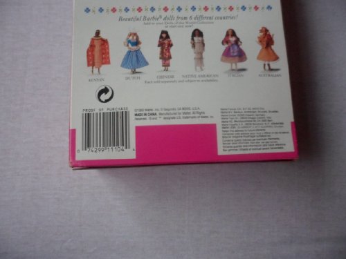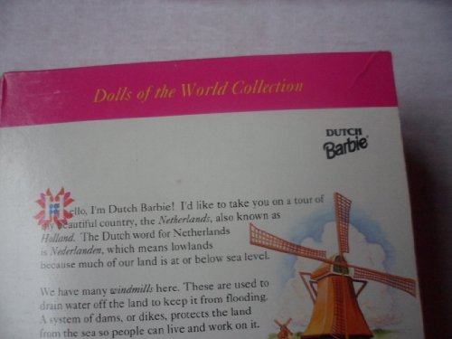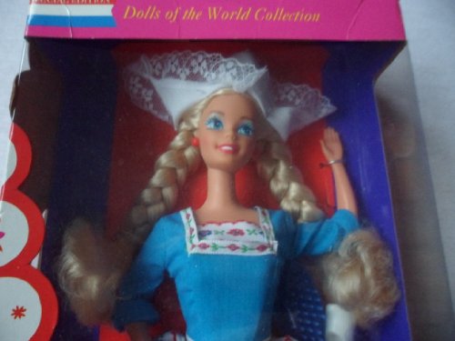 Dutch Barbie doll wears a costume native to the fishing village of Volendam. Her dress includes a blue bodice and striped skirt accented with an embroidered collar and apron. Her hulletje, a traditional white bonnet, rests atop her blond braided hair, and flairs out to the sides. Her delicate feet are encased in white "wooden" shoes, called klompen, that are perfect for life in the Netherlands because they keep the feet dry, regardless of the weather. Release Date: 1/1/1994
