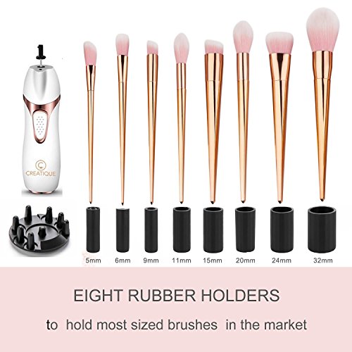 - PERFECT FOR ALL YOUR MAKEUP BRUSHES! The 8 different sizes of collards (11.81”, 9.44”, 7.48”, 5.90”, 4.33”, 3.54”, 2.75” and 1.96”) can hold almost all sizes of makeup brushes, 1 spindle, plastic bowl with splash guard, collard holder, makeup brush cleaner spinner and storage Bag. The professional makeup brush cleaner needs 2 AAA Batteries. Batteries are NOT INCLUDED. FYI, Double sided brushes and extra large sizes brushes cannot be handled by this machine.