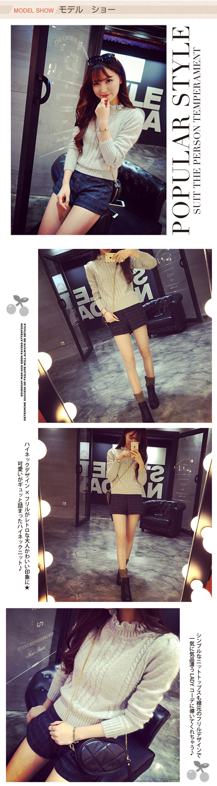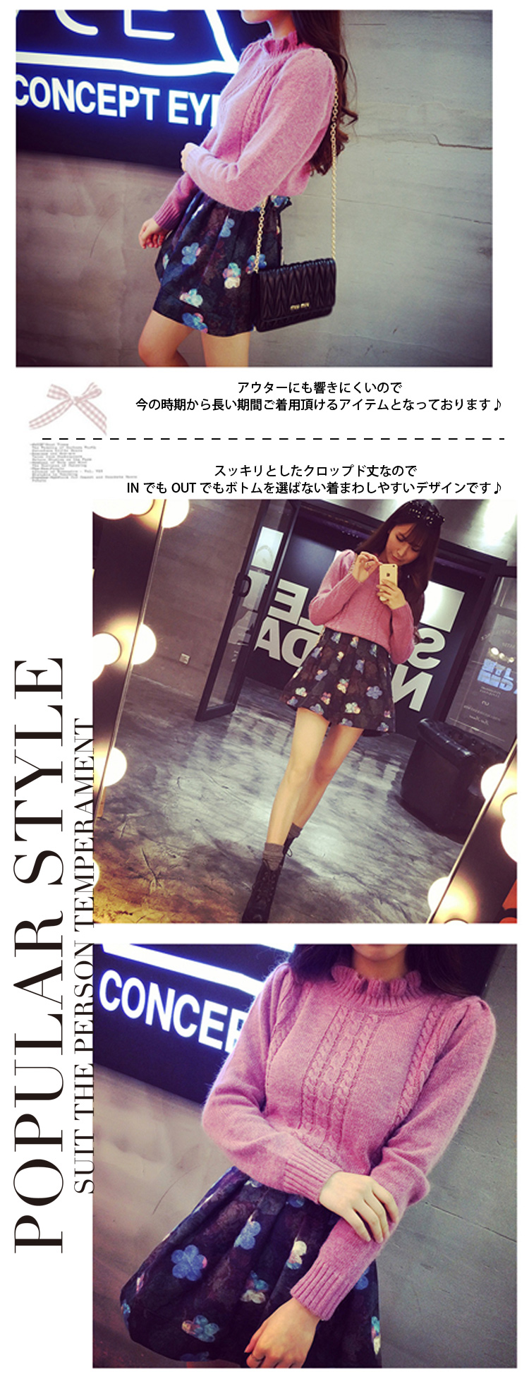 | ハイネックデザイン×フリルがレトロな大人かわいい印象に★可愛いがギュッと詰まったハイネックニット?シンプルなニットトップスも襟元のフリルデザインで一気に気品漂うLADYコーデに導いてくれちゃう?細いリブ編みニットは厚みがあり、風を通しにくく体にピッタリフィット?スッキリとしたクロップド丈なのでINでもOUTでもボトムを選ばない着まわしやすいデザインです?アウターにも響きにくいので今の時期から長い期間ご着用頂けるアイテムとなっております? | |