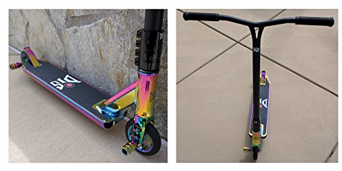 -. Feature : Dialed, Solid and Light - Looks Amazing! / Best compression on the market - 4 Bolt SCS Clamp, 25 inch tall and 23 inch wide Chromoly steel Flat Black custom bars. / Itegrated 4.5 inch wide by 21 inch long T7 neo chrome (oil slick) deck. / 110 mm DIS Black Slicks Metal Core 5 spoke wheels with durable high rebound polyurethane. ABEC-11 high speed bearings. / Front and Rear wheel Oil Slick Pegs included! Black DIS logo grip tape. Scooter comes with 2 sets of axles, one for use with pegs and one set for use without pegs.