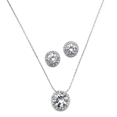 Mariell's dazzling round CZ necklace set is plated in beautiful silver rhodium for that sought-after look of platinum and diamonds! This beautiful wedding necklace and earring set is a classic round design perfect for brides, bridesmaid's gift and will accessorize any occasion with just the right amount of head-turning sparkle. The 12mm round CZ bridal pendant is framed with a circle halo of delicate inlaid micro-pave stones and measures 5/8" w. It suspends gracefully from a 16" chain. The 10mm CZ stud earrings are framed with dainty pave stones and measure 7/16" w each. Don't miss this elegant, rich-looking jewelry set featuring AAAAA grade Cubic Zirconia and genuine Silver Platinum plating. We promise you'll adore this best-selling tailored stunner or your money-back. Treat yourself or someone you love to some seriously gorgeous glamour with a chic, understated silhouette. Enjoy Mariell's exclusive Risk-Free purchase and Lifetime Guarantee.Feature
