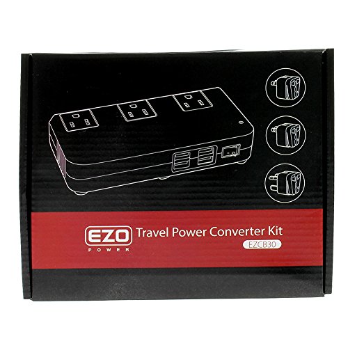 Package Contents: EZOPower power converter, EU power cable, 3 international plugs (US, UK, AU).