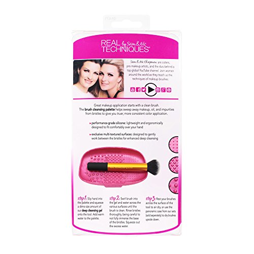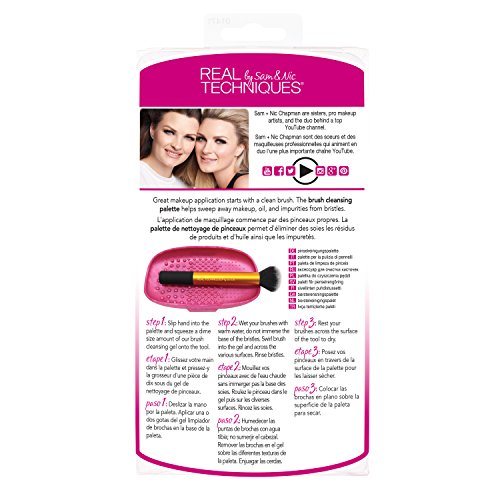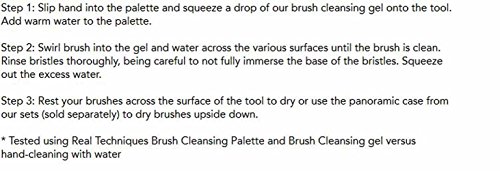 Great makeup application starts with a clean brush. The brush cleansing palette helps sweep away makeup, oil, and impurities from bristles to give you truer, more consistent color application. performance grade silicone: lightweight and ergonomically designed to fit comfortably over your hand exclusive multi textured surfaces: designed to gently work between the bristles for enhanced deep cleansing Step 1: Slip hand into the palette and squeeze a drop of our brush cleansing gel onto the tool. Add warm water to the palette. Step 2: Swirl brush into the gel and water across the various surfaces until the brush is clean. Rinse bristles thoroughly, being careful to not fully immerse the base of the bristles. Squeeze out the excess water. Step 3: Rest your brushes across the surface of the tool to dry or use the panoramic case from our sets (sold separately) to dry brushes upside down. * Tested using Real Techniques Brush Cleansing Palette and Brush Cleansing gel versus hand cleaning with water