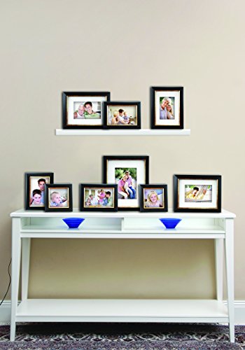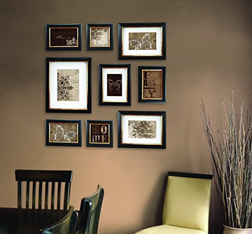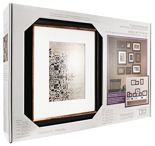 MCS 9 Piece Frame set is in a Bronze Finish. The Frame Sizes include 1-8x10 with mat to fit 5x7 photo, 2-6x8 with mats to fit 4x6 photos, 1-5x7 with mat to fit 3.5x5 photo, 3-4x6, 2-4x4. The removable mats provide alternative photo openings for 1- 8x10, 2-6x8 and 1-5x7. All 9 frames have easel backs for table top display as well as hanging hardware so they can be mounted vertically or horizontally. The frames have a dark bronze finish with an antique bronze interior border. The frame set is supplied with suggested wall layouts.Feature