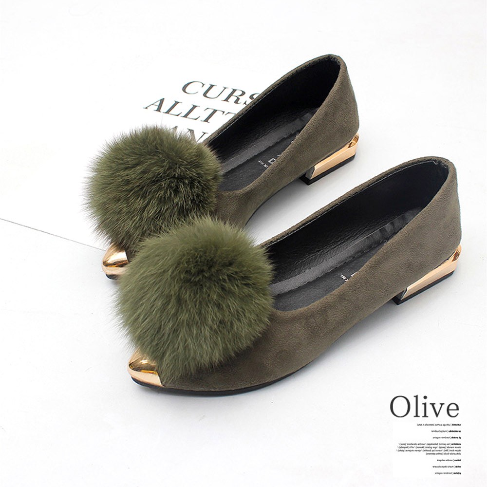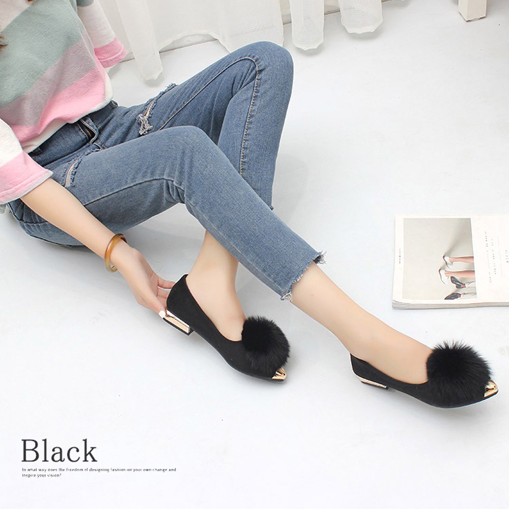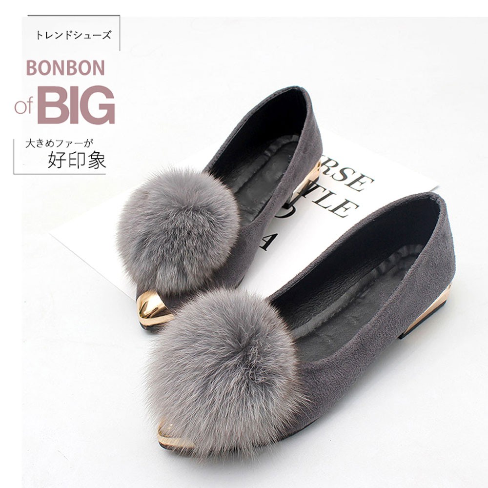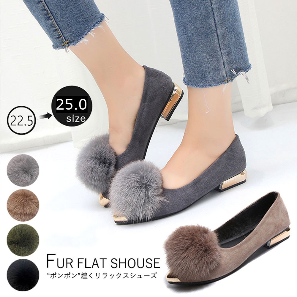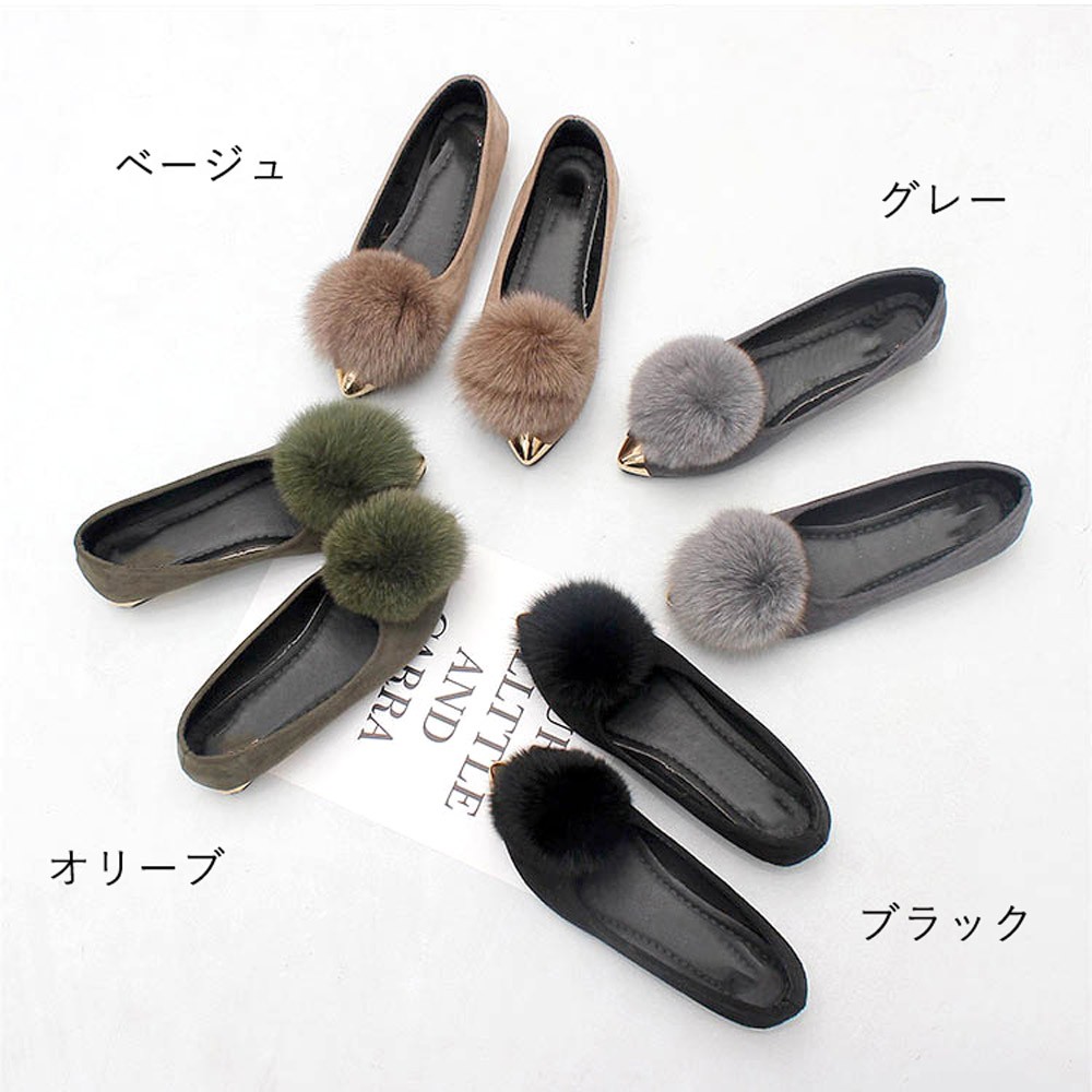 アッパーを飾るぽんぽんファーがアクセントになって、トレンドの先端が尖っているデザインでおしゃれ度高まる