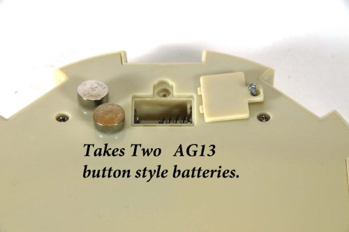 Dual sounding starter/centerpiece makes chicken crowing or choo choo train sounds by pressing on the center of the unit. Centerpiece measures 6 inches in diameter. Takes 2 AG13 (or LR44) batteries. It does come with a mediocre set of batteries which will probably require replacement early on. Includes 8 small colorful train marker and 2 chicken markers.