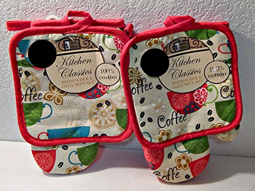 4 Piece Kitchen Set Retro Coffee Theme Potholders & Oven Mitts
