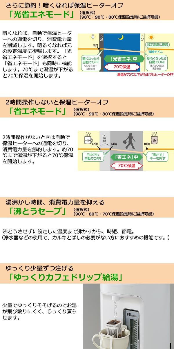 | 電気で沸かしてまほうびんで保温する電気まほうびん。プラグをはずしても乾電池のチカラで、電動給湯できます。1300Wの「ハイスピード沸とう」でたっぷりのお湯が素早く沸きます。大きな文字と分かりやすい操作パネルで、シニアの方にも見やすく操作しやすいように設計しました。 |