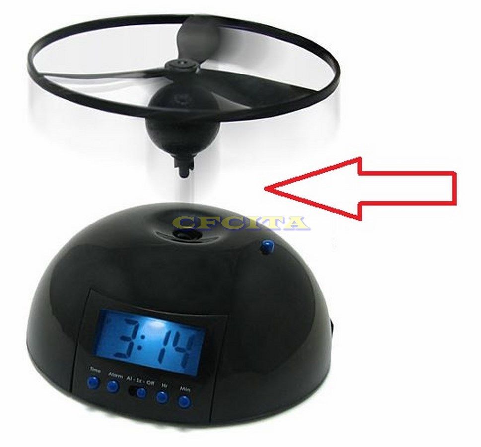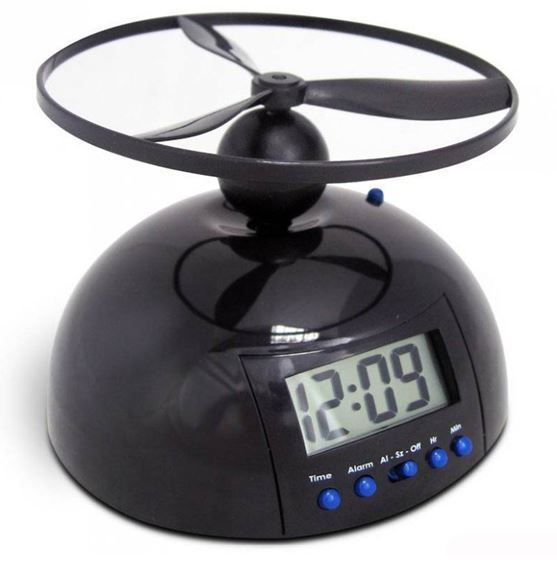 An alarm clock with a flying attachment that takes off when the alarm sounds.