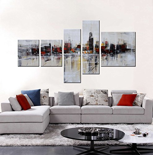 -. Title : ARTLAND Modern 100% Hand Painted Abstract Oil Painting on Canvas "Fog City" 5-Piece Unframed Wall Art for Living Room Artwork for Wall Decor Home Decoration 28x46inches
