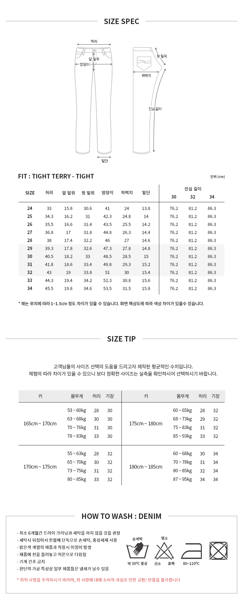 | 데님 및 컬러 원단 제품 등을 세탁 시에 이염 될 우려가 있으므로 찬물 단독 세탁을 권장합니다. 제품의 세탁 표기를 확인 후 세탁하세요. |