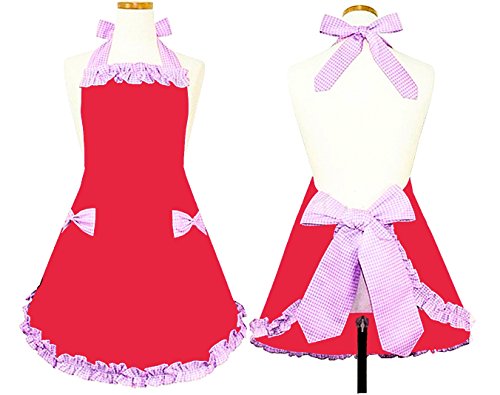 Hyzrz Cute Red and Pink Handmade Kitchen Restaurant Aprons for Girls Women Apron with Pockets for Gift