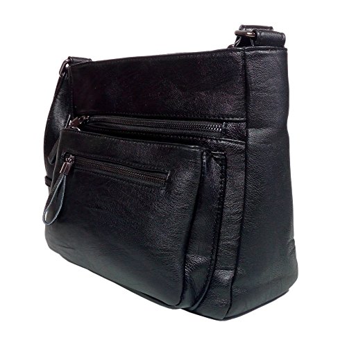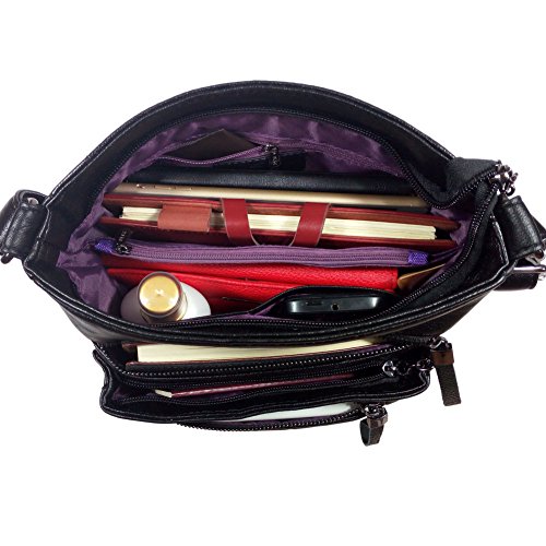 Multi-pocket crossbody bag features an adjustable strap with a 12 to 21 inch drop length that can be worn over the shoulder or cross the body