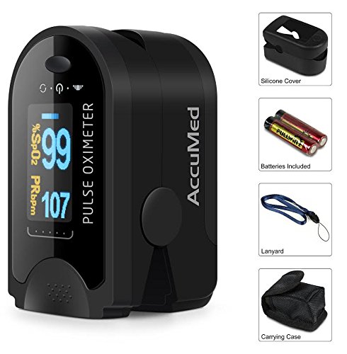 -. Binding : Misc. -. Brand : AccuMed -. Color : Black -. EAN : 0641378487293 -. Feature : AccuMed's digital LED display with low power consumption plus auto-power off feature allows for 40 continuous hours of battery life. / Cover against ambient light offers superior ease of reading. Fast and accurate SpO2 and pulse measurements. / Accommodates pediatric to adult finger sizes and can be used by sports and exercise enthusiasts as well as anyone interested in measuring pulse rate and oxygen saturation. / Includes 2 AAA batteries, lanyard, and convenient carrying case. / Guaranteed by 1 US year warranty offered exclusively by AccuMed. -. IsAutographed : 0 -. IsMemorabilia : 0 -. Label : AccuMed -. Manufacturer : AccuMed -. MPN : ACCMS50D-Black -. PackageQuantity : 1 -. PartNumber : ACCMS50D-Black -. ProductGroup : Sports -. ProductTypeName : SPORTING_GOODS -. Publisher : AccuMed -. Size : CMS-50D -. Studio : AccuMed -. Title : AccuMed® CMS-50D Pulse Oximeter Finger Pulse Blood Oxygen SpO2 Monitor w/ Carrying case, Landyard Silicon Case & Battery (Black) -. UPC : 641378487293