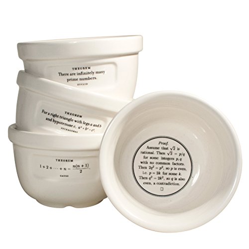 -. Feature : A set of four ceramic pudding bowls with the proofs to classic theorems of Euclid, Hippasus, Pythagoras, and Gauss. / Terrific gift for mathematiciana, scientista, studenta, or any geek on your gift list. / Each bowl is 4-inches in diameter and 2-inches tall --- and yet so deep. / Comes in a fun gift box.