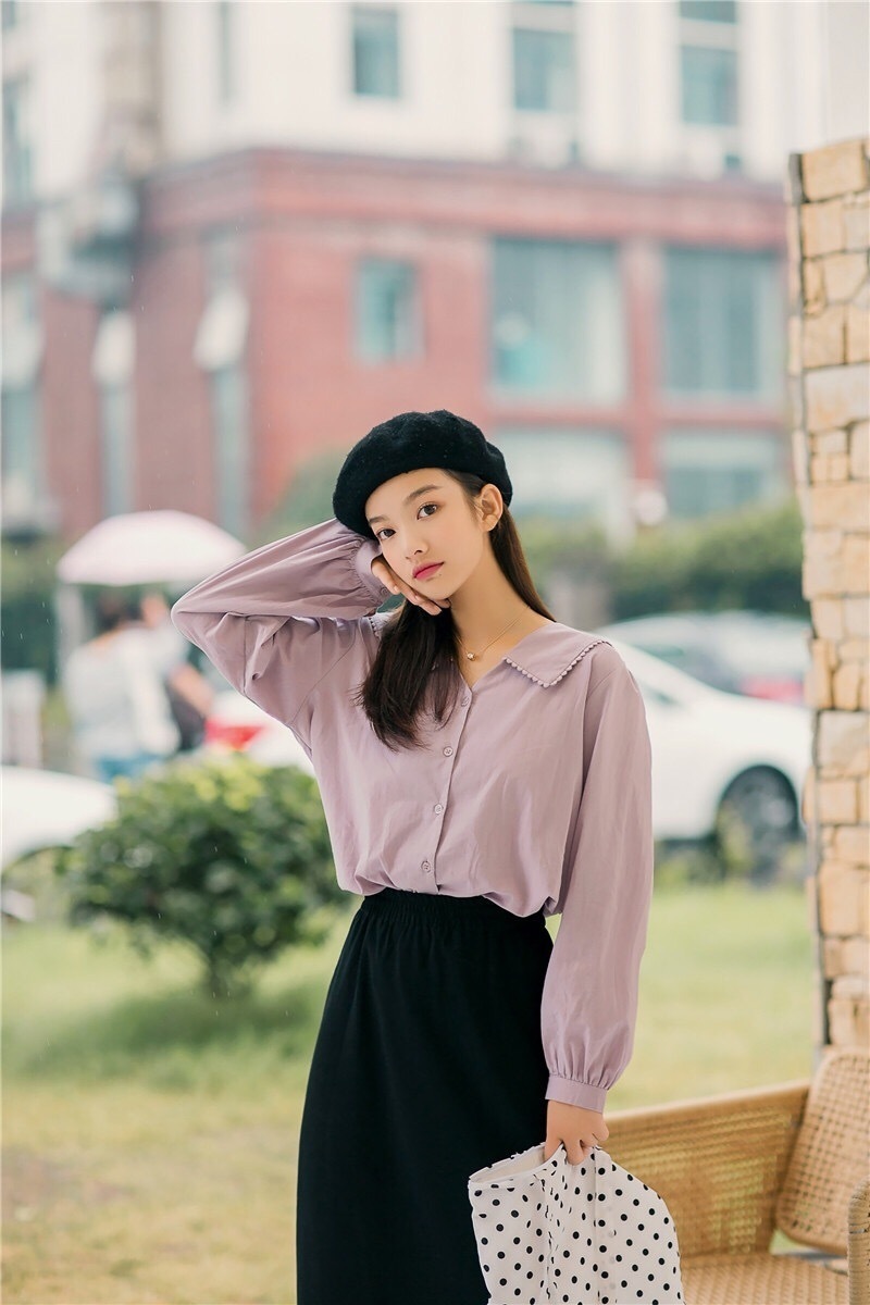 落ち着いたカラーで、シンプルながらも女性らしく清楚な雰囲気の長袖ブラウスです。