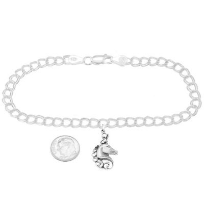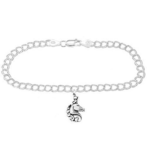 -. Binding : Jewelry -. Brand : Lgu -. Department : womens -. Feature : Oxidized Sterling Silver Charm Attached with Split Ring / Polished Silver Double Link 4 millimeter Charm Bracelet / Charm weighs approximately 2.3 grams. Total weight of bracelet and charm combined will vary according to bracelet size. / Sample Bracelet With Lots of Charms Not Included / Approximately 29 mm x 16 mm (1.14 inch x 0.63 inch) -. ProductGroup : Jewelry -. ProductTypeName : FASHIONNECKLACEBRACELETANKLET -. Title : Sterling Silver Mystical Unicorn Head on 4 Millimeter Charm Bracelet