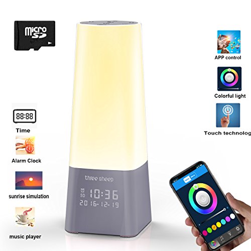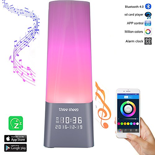three sheep wake up light, but only only a light, that is designed to provide a calming, colorful, comfortable, romantic environment, making people easier to concentrate, relax, or get some deep sleep. Use your smart phone to install the "three sheep" APP and connect the device via Bluetooth, you can control the device freely: Music mode(pre-record/Memory card), Lighting Mode(Manual/Automatic-FadeFlash), Alarm Clock, Time. Also with a simple touch-sensitive operation panel on top, giving you convenient control. 1600M RGB color changing, on the APP control, there is an palette UI, normal and effect mode, under the effect mode, with fade and flash option. Changing color effect, provide you an colorful and romantic environment, decorate your room and enjoy your life. Delight family friends with a stunning, vibrant, dynamic display spanning the 1600W-RGB-color spectrum - Red, orange, yellow, green, blue, violet, and everything in-between. Or pick and pause on your perfect color. Set the mood for any occasion. Voice sensor with Low, Middle and High three level, the environmental noise could activate the device, if you let the bedside lamp standby mode, and set the certain decibel. Perfect for your crying babies. Compact and fashion design, great for decoration in your home or office. Eye-Safe, Comfortable, rich, warm light on every setting. No eye-harming glare. Energy-efficient LED technology saves you money and minimizes environmental impacts. Enjoy bright and colorful mood lighting that's eye-safe and energy-efficient. 0 |
