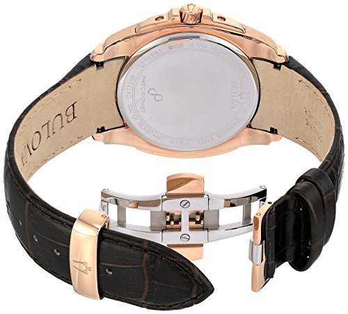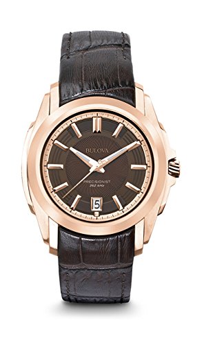 The most accurate watch in the world with a continuously sweeping second hand. In stainless steel with rose-gold finish, domed metalized crystal, multiple-layer brown and rose-gold dial, continuously sweeping second hand, luminous hands, calendar, padded and stitched dark brown leather strap, locking deployment buckle and dresistance to 30 meters. Duet: 97M104Feature