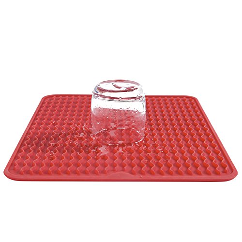 -. Feature : 16 x 12 inch multipurpose silicone glass drying mat and hot pad. / Dual-surface design features a ridged top surface to provide airflow for drying dishes and glassware face down, and a flat, grooved bottom surface for a secure grip on smooth surfaces. / Mat is also useful as a hot pad for holding hot pans, pots, or casseroles. / Heat-resistant up to 450 °F and dishwasher safe. / Approximate Dimensions (in inches): 15.7 L x 12 W x 0.07 D.