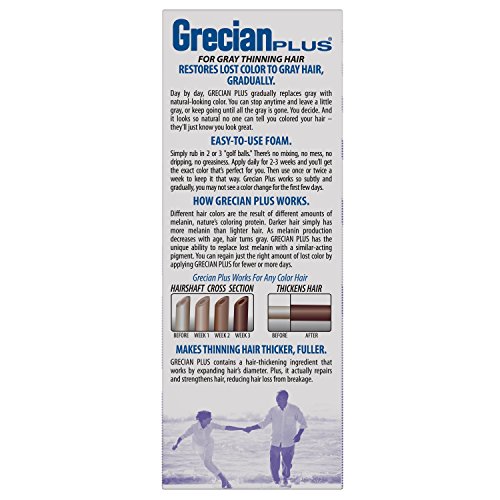 ReleaseDate : 2016-02-20 Studio : Grecian Formula Publisher : Grecian Formula Binding : Health and Beauty Product Description Grecian Formula Foam Hair Color with Conditioner is not a typical hair color formula. It's more of a personalized version that actually lets you replace gray hair with your natural color. Plus, you can always stop in between to keep a little gray to get an experienced look. Hair color comes from melanin, and as we age melanin production in body decreases. Grecian Formula replaces it with a similar pigment over time so you can control how much color you want in your hair.?Grecian Formula Foam Hair Color with Conditioner can gradually restore your hair color but it also makes thinning hair better. It contains hair thickening agents that repair and strengthen, reducing hair loss from breakage. The result: healthier, thicker-looking hair. Read instructions before proceeding. Made in the USA. 0