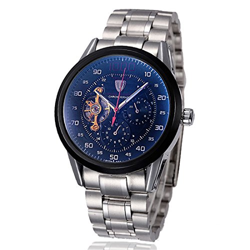 -. Feature : MOVEMENT: Automatic mechanical movement, self winding mechanical movement lets you wear the watch anytime. / NOTE: The sub dial just for decoration, no function. / FASHIONABLE: Blu-ray glass cover, tourbillon and small sub dial on the dial. Good quality silver stainless steel bracelet strap. / WATER RESISTANT: Daily waterproof, such as splash and rain, but not for shower and swimming. / LUMINOUS FUNCTION: Luminous analog, easy to read in the dark, sometimes need to be exposed to strong light for a while.