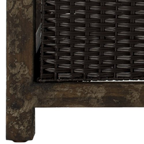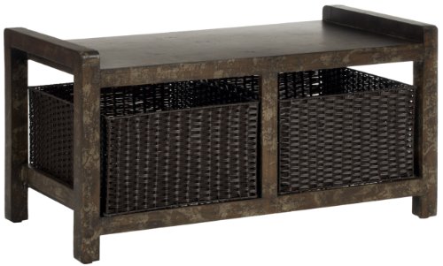 -. Feature : Dimensions: 36.3W x 18D x 18.3H in. / Birch wood construction / Dark brown finish / 2 wicker storage baskets / Rustic style
