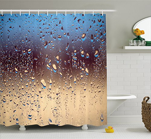 Farmhouse Decor Shower Curtain by Ambesonne, Close Up Rain Drops on Glass Natural Sprays Sphere Azure Picture, Fabric Bathroom Decor Set with Hooks, 70 Inches, Metallic Blue Beige
